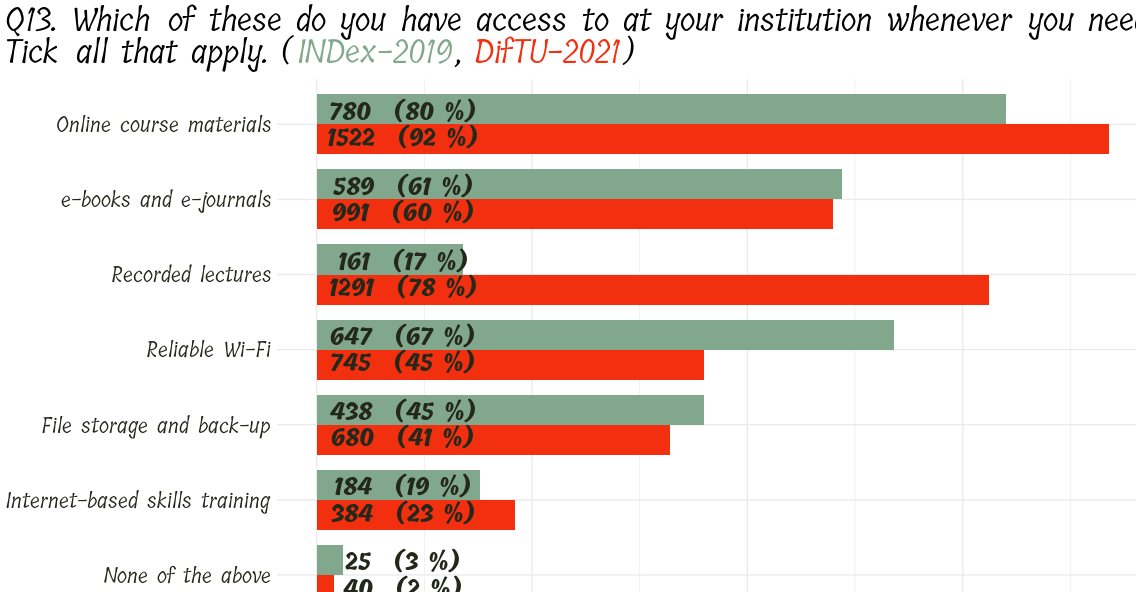 From the responses to the question below, we can the impact of restrictions on new ways of course delivery, note the overall increase in all things digital from INDEx to DifTU.